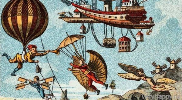 Научные и технологические утопии, которая развивалась в начале 19-го века породили много фантазий на тему удивительной техники будущего. Эти утопические летающие машины были представлены на французской открытке, изданной в 1890-е годы.