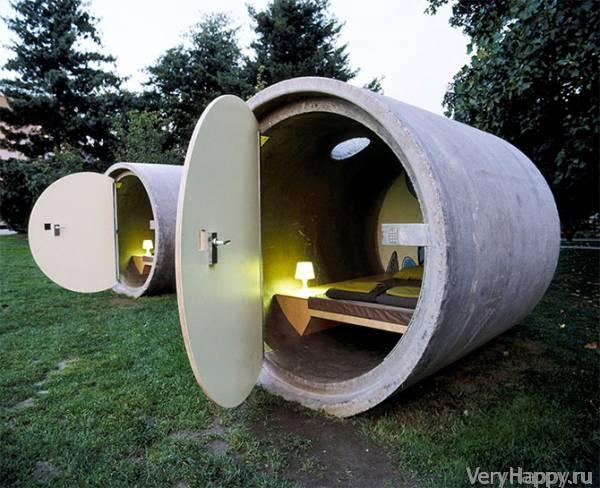 Жизнь в гараже — мало оригинальный праздник? Есть и другой вариант: отпуск… в канализационной трубе. Проект придуман в Австрии и предназначен для экономичных туристов и посетителей крупных опен-эйров. Первый такой отель уже принимает гостей на берегу Дуная недалеко от Линца.