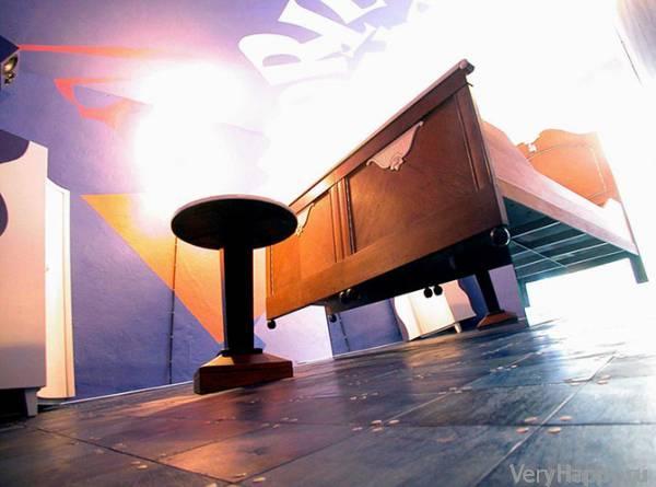 Гости отеля могут переночевать в клетке льва (правда, без львов) или под нож — стилизованные лампы. А может, и унести всю ночь. В последнем случае стоит выбрать номер с «летающей кроватью» и наклонным полом. Стоимость номеров довольно «тяжелая» — от 70 до 115 евро за ночь.