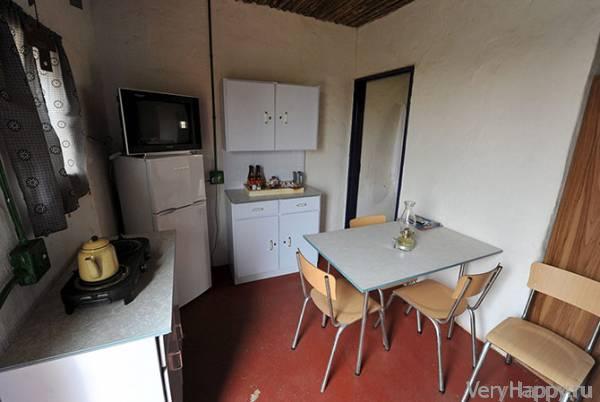 Мебель в комнатах, похожих, скорее, на гаражи, также вписывается в концепцию: мебель и минимум техники, все выглядит так, как будто родом из 80-х годов. Туалет — на улице. Готовить можно в традиционной африканской каменной печи (одна на весь комплекс). Но на самом деле полы с подогревом.